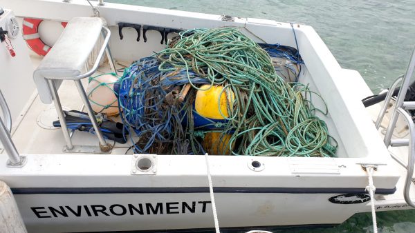 Dispositif de concentration de la pêche et filet fantôme retrouvés flottant au large du port de George Town. – Photo : DoE