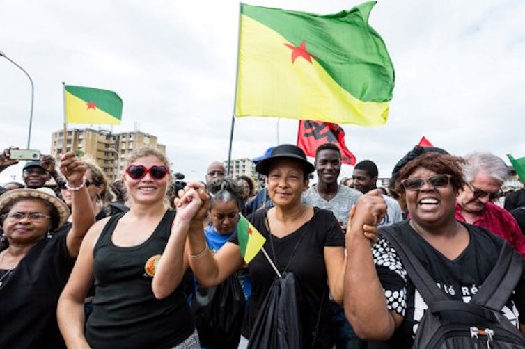 Des manifestants brandissent le drapeau de la Guyane durant la grève générale du 28 mars, à Cayenne. Jody Amiet/AFP