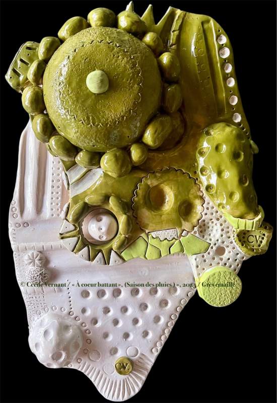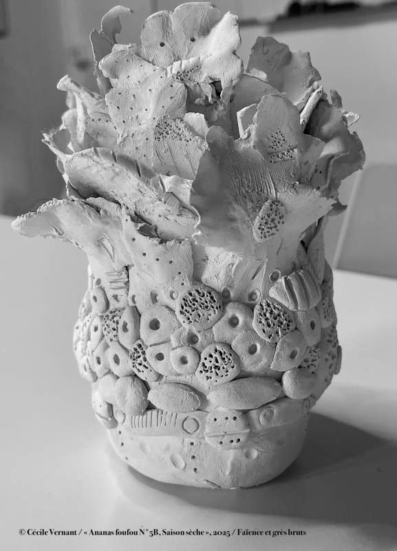 Ses céramiques, entièrement modelées à main levée avec des outils détournés – boulons, pinceaux, roches volcaniques, matériel de couture – évoquent tantôt le monde marin (pièces à poser), tantôt les grandes falaises terrestres de la Martinique (pièces murales). Émaillées ou brutes selon les saisons, elles portent en elles la mémoire tactile de l’île.
