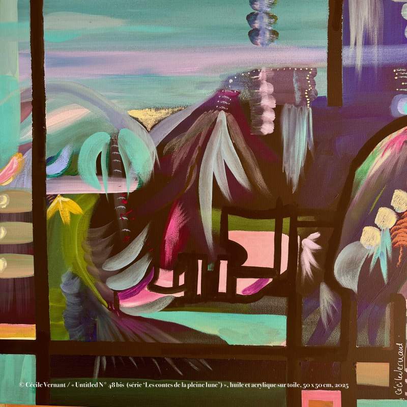 Pour s’adapter aux lieux, Cécile Vernant a choisi de centrer son accrochage sur la série “Les contes de la Pleine Lune”, visible dès l’entrée sur le mur bleu. Ces créations multidimensionnelles jouent avec les segmentations graphiques qui évoquent à la fois l’architecture abandonnée de l’île et les querelles artistiques d’antan entre Art nouveau et Art déco – entre rondeurs et angles.