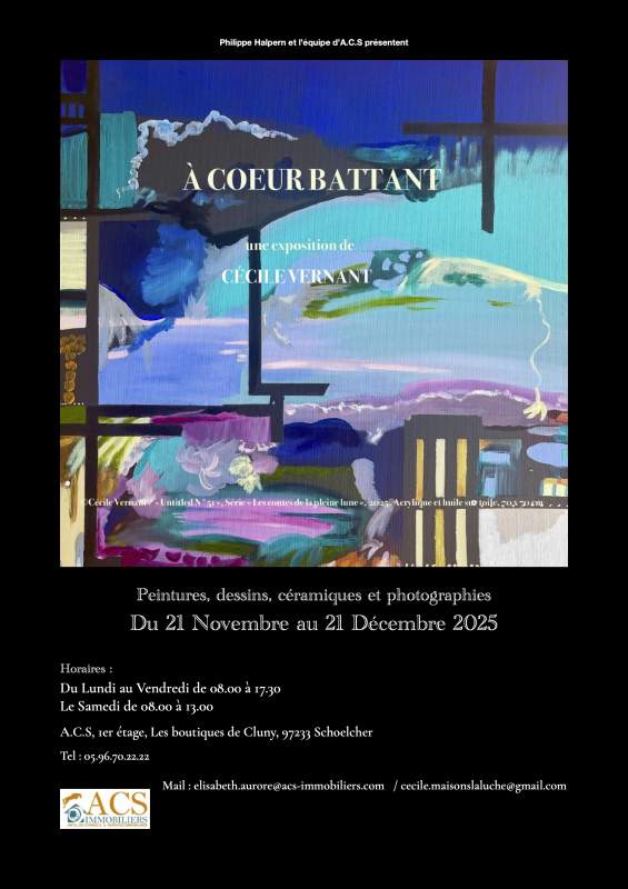 Nous étions au vernissage de l’exposition “À Cœur Battant” de Cécile Vernant, qui se tient du 21 novembre au 21 décembre 2025 à A.C.S Immobilier, au premier étage des Boutiques de Cluny. Dans une ambiance chaleureuse et bon enfant voulue par l’artiste, loin du formalisme parfois “snob” de l’art contemporain, les visiteurs ont pu découvrir un univers singulier où se mêlent mémoire, poésie et ancrage caribéen.