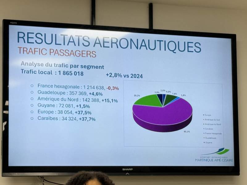 Le bilan trafic 2025 confirme la dynamique de croissance engagée depuis la période post-pandémique. Si le trafic global est en hausse par rapport à 2024, les réalités sont contrastées selon les segments. Le trafic national, correspondant aux liaisons avec la Guadeloupe et la Guyane, reste relativement stable, tandis que la France hexagonale, qui représente encore 65 % du trafic total, affiche une quasi-stagnation (environ +3 %). Deux facteurs expliquent cette situation : les effets résiduels des mouvements sociaux de 2024, dont les images diffusées ont eu un impact négatif sur l’image du territoire, et le renchérissement du coût de la vie qui a dissuadé certains touristes.