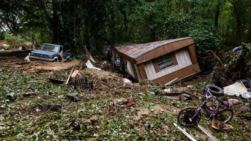 Des débris et un mobile home sont empilés le long d’une ligne d’arbres à Old Fort, en Caroline du Nord, le 29 septembre.