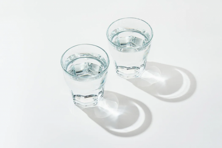 Deux verres d’eau pure et fraîche sur fond blanc avec la lumière du soleil dans l’ombre profonde du verre.
