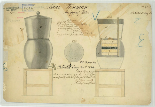 Dessin du brevet d’Isaac Wiseman pour une méthode de purification de l’eau, 1834 via Wikimedia Commons