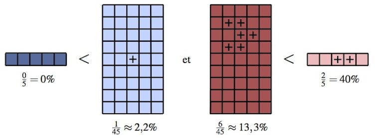 Illustration du paradoxe de Simpson avec des données caricaturales : chaque personne est représentée par un carré, la couleur du carré correspondant à une classe d’âge, la teinte foncée ou claire au statut de vaccination ; une petite croix représente un décès. On peut comparer facilement les taux de mortalité dans chaque classe d’âge et par statut de vaccination. Quentin Berger et Francesco Caravenna, Fourni par l’auteur