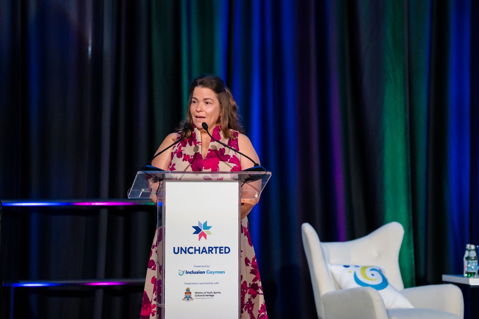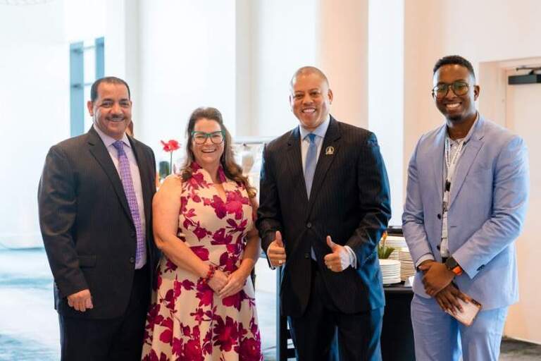 Lors de la conférence Uncharted, on pouvait apercevoir, de gauche à droite : le ministre de l’Éducation, Rolston Anglin ; la directrice générale d’Inclusion Cayman, Shan Harriman ; le Premier ministre André Ebanks ; et Nathan Chesney, animateur pour Inclusion Cayman. – Photos : Janet Jarchow/AirVu Media