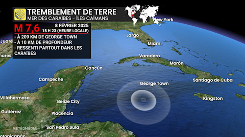 L’épicentre du tremblement de terre a été localisé à environ 208 kilomètres (130 miles) au sud-ouest de George Town, dans les îles Caïmans.