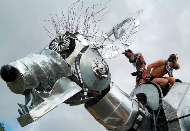 Michel Pétris, professeur en design à l’Ecole d’Art, a aussi accompagné quelques-uns de ces projets sur le versant de l’ingénierie de fabrication. Son parcours témoigne de la porosité entre art, techniques de construction et spectacle vivant. Il a collaboré, avec Hervé Beuze, à la réalisation du Chienfer, gigantesque marionnette de rue articulée en fer, conçue en 2007 pour le spectacle de rue Mayétetpiépoutet de Joby Bernabé. Destiné à l’espace public plus qu’au seul carnaval, même s’il en fit l’ouverture cette année-là, le Chienfer relevait d’une prouesse technique comparable aux grandes machines du Royal de Luxe. Articulations, équilibre, résistance des matériaux : sa conception nécessita une collaboration avec un atelier de fabrication monumentale de Marseille et mobilisa des compétences, au-delà du geste artistique.
