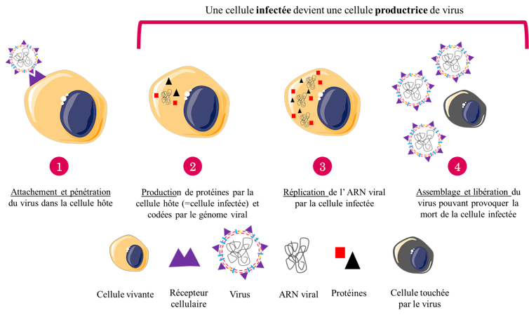 Un virus n’est pas un organisme autonome : il a besoin d’une cellule hôte pour se reproduire. Le virus y rentre par le même principe qu’une clé dans une serrure. Les protéines S (pour Spike en anglais signifiant pointe), présents au niveau de l’enveloppe virale des coronavirus, se fixent à certains récepteurs cellulaires. Le virus est ensuite internalisé. Une fois à l’intérieur de la cellule, le « virus père » est reproduit par la cellule infectée en plusieurs « virus fils » qui iront à leur tour contaminer les cellules voisines. Le SARS-CoV-2 est un virus à ARN. Cela signifie que son génome est codé sous forme d’ARN, pour acide ribonucléique. L’ARN, tout comme l’ADN, est composé d’une suite de briques chimiques appelés les nucléotides. Par rapport à un virus à ADN, le SARS-CoV-2 gagne du temps ! En effet, l’ARN permet la synthèse directe de protéines, alors que l’ADN doit être d’abord transcrit en ARN avant d’être traduit sous forme de protéines.