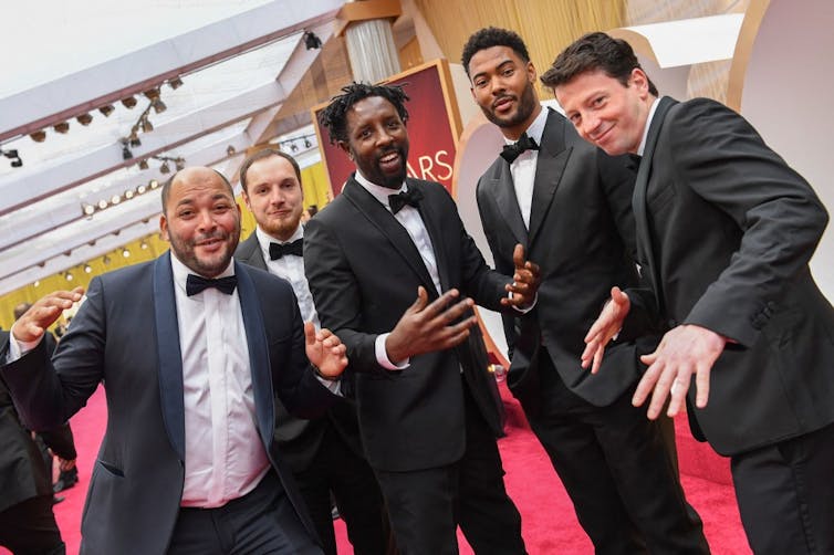 Ladj Ly au centre entouré de quelques uns des membres du film « Les Miserables » lors de la cérémonie des 92e Oscars en Californie le 9 février 2020. Valerie Macon/AFP