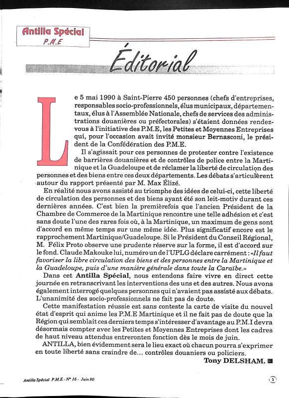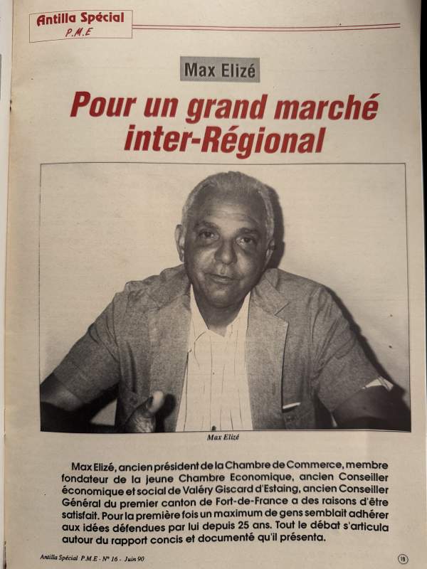 En 1990, dans un numéro spécial de Antilla consacré aux PME, notre confrère Tony Delsham donnait la parole à une figure majeure de la vie économique martiniquaise : Monsieur Max Elizé, ancien président de la Chambre de commerce, conseiller économique et social, et ardent défenseur d’un projet visionnaire : la création d’un véritable marché interrégional entre les départements français d’Amérique (DFA).