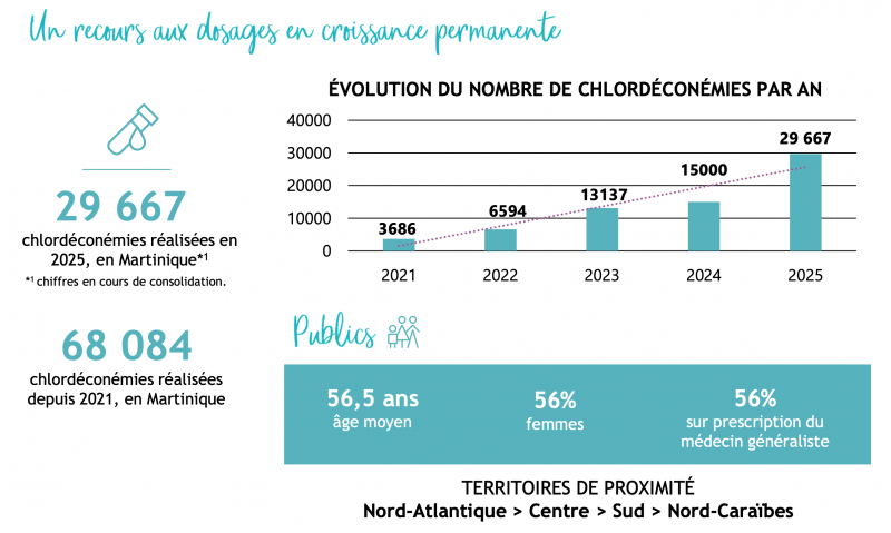 L’ARS Martinique enregistre une augmentation significative du recours à la chlordéconémie, ce test sanguin gratuit et accessible sans ordonnance dans la quasi-totalité des laboratoires de l’île. En 2025, 29 667 analyses ont été réalisées en Martinique, soit près du double par rapport à 2024 (15 000 tests). Depuis le lancement du dispositif en 2021, 68 084 chlordéconémies ont été effectuées sur le territoire martiniquais.