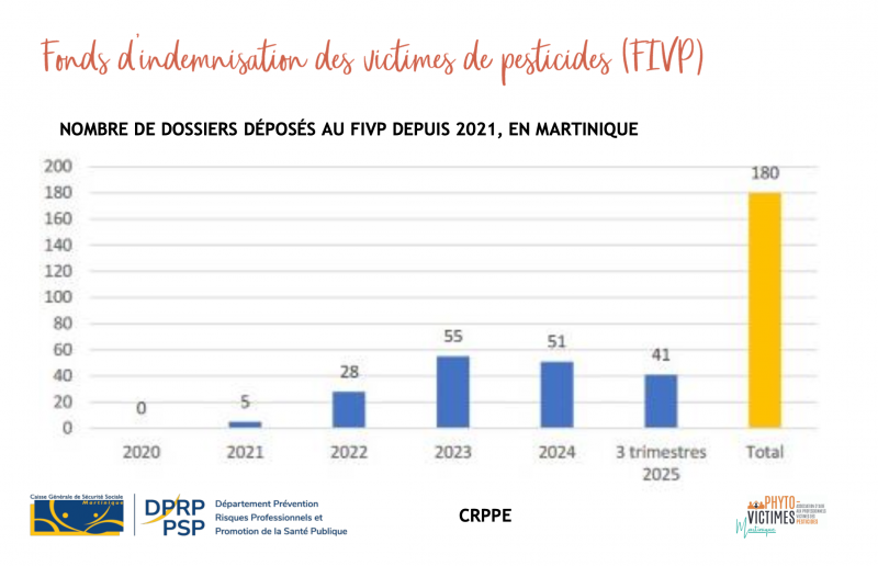 Le Fonds d’Indemnisation des Victimes de Pesticides (FIVP) connaît une forte accélération des demandes. En Martinique, 180 dossiers ont été déposés au FIVP depuis 2021, avec une progression marquée en 2025 : 41 dossiers déposés sur les trois premiers trimestres, contre 51 en 2024 et 55 en 2023.