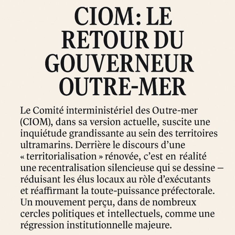 Le Comité interministériel des Outre-mer (CIOM), dans sa version actuelle, suscite une inquiétude grandissante au sein des territoires ultramarins. Derrière le discours d’une « territorialisation » rénovée, c’est en réalité une recentralisation silencieuse qui se dessine, réduisant les élus locaux au rôle d’exécutants et réaffirmant la toute-puissance préfectorale. Un mouvement perçu, dans de nombreux cercles politiques et intellectuels, comme une régression institutionnelle majeure.