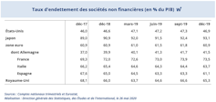 Selon un rapport de la Banque de France en 2019, les entreprises françaises sont plus endettées que leurs homologues italiennes, allemandes et espagnoles. Ainsi, la dette des sociétés françaises représentait 73,5 % du PIB du pays fin 2019 (63,7 % en Italie, 41,5 % en Allemagne, 61,1 % en Espagne). Selon les Échos, le risque lié à l’endettement estdavantage du côté des TPE-PME que des grands groupes.