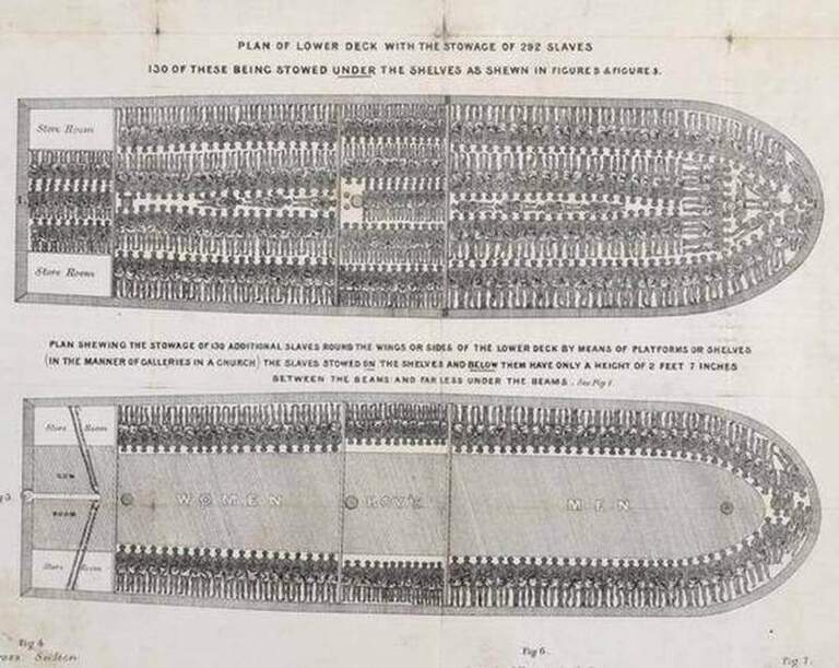 Le document se base sur les prescriptions du Dolben Act : votée en 1788, cette loi réglementait le nombre de captifs selon le tonnage du bateau, il s’agit donc des conditions de transports selon cette loi. En réalité, le Brooks avait déjà convoyé jusqu’à 740 malheureux ! Mais même avec ces inexactitudes, on comprend en effet mieux l’inhumanité de la traite. « Entre deux planches, la hauteur de 83 cm permettait à un homme petit de s’asseoir et à un grand de se tenir sur les coudes. Mais la largeur allouée à chacun, entre 40 et 43 cm, obligeait la plupart à se tenir sur le côté, plutôt que sur le dos », rappelle le site de décryptage d’images historiques, L’Histoire par l’image .
