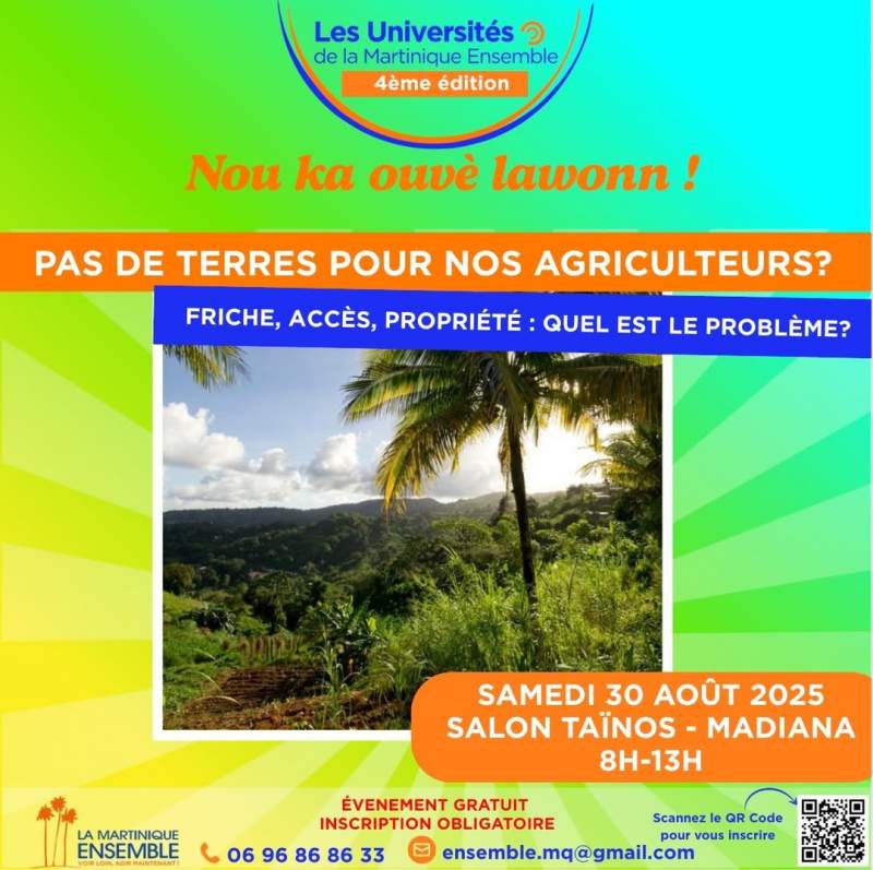 « La Martinique Ensemble » invite le public à un moment unique de dialogue autour d’un sujet qui nous concerne tous : notre agriculture. Prix des productions, régularité des approvisionnements, accès aux terres, contraintes des producteurs… toutes les questions seront abordées, dans un esprit d’écoute et de respect.