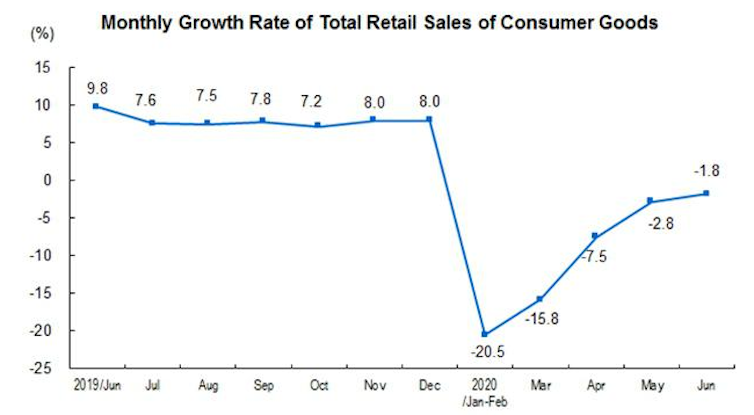 Évolution des ventes au détail de biens de consommation en Chine entre juin 2019 et juin 2020. Bureau national des statistiques de Chine