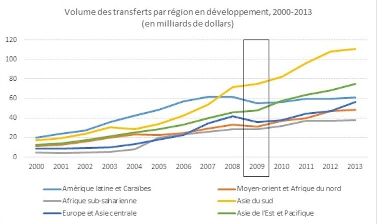 Conséquence de la crise, le volume global des transferts avait connu cette année-là une baisse significative dans plusieurs régions en développement, comme le montre le graphique suivant.