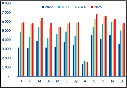 Pour l’ensemble de l’année 2025, les DOM enregistrent une augmentation de +16 % par rapport à 2024, après une hausse de +12 % sur l’ensemble de l’année 2024 et de +44 % en 2023. Cette hausse place la région dans le Top 3 de hausses les plus importantes sur l’année derrière les Pays de la Loire mais devant la Corse.