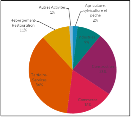 Sur les 12 derniers mois, 3 secteurs sont principalement touchés par les défaillances dans les DOM : les services (36 %), la construction (23 %) et le commerce (18 %).