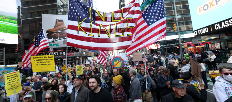 Les manifestant·es dénonçaient ce qu’ils perçoivent comme la dérive autoritaire du président Donald Trump, accusé de se comporter « en monarque ». Pancartes en main, ils affichaient des slogans comme « Pas de dictateurs, pas de rois ! », réaffirmant leur attachement à la démocratie et à la limitation du pouvoir exécutif. Certains étaient costumés en figures historiques de la Révolution américaine, détournant le symbole de la monarchie contre le président sortant.