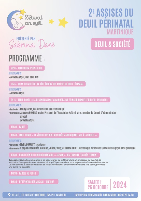 Le 26 octobre 2024, la Villa FL au Lamentin accueillera les Deuxièmes Assises du Deuil Périnatal de Martinique, un événement essentiel pour sensibiliser à un sujet trop souvent entouré de silence : la perte d’un enfant durant la grossesse, à la naissance ou peu après. Organisées par l’association Zétwal An Syèl, ces assises visent à briser le tabou autour du deuil périnatal et à offrir un espace de dialogue aux familles endeuillées, aux professionnels de santé et aux acteurs associatifs.