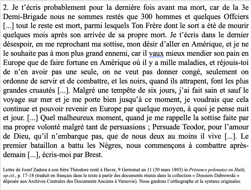 De plus, une lettre de Jozef Zadora, adressée à son frère Théodore, décrit une situation désespérée dans laquelle seuls quelques centaines de soldats survivent aux combats et aux maladies tropicales. “Je t’écris probablement pour la dernière fois avant ma mort […] il vaut mieux mendier son pain en Europe que de faire fortune en Amérique,” écrit-il avec amertume.