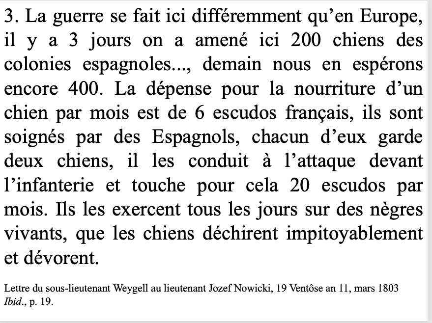 La guerre en Haïti se distingue par une violence extrême, souvent dirigée contre les populations locales. L’utilisation de chiens pour attaquer les insurgés est un des exemples les plus horribles de cette brutalité. Dans une lettre, un soldat polonais décrit comment 200 chiens, spécialement entraînés et amenés des colonies espagnoles, étaient utilisés pour traquer les Haïtiens. Ces chiens, soignés par des Espagnols et conduits à l’attaque, dévoraient les captifs sans pitié.