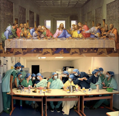 Les deux groupes sont drapés à la romaine, le personnel médical reflétant le langage corporel de Jésus et de ses disciples dans le chef-d’œuvre de De Vinci.