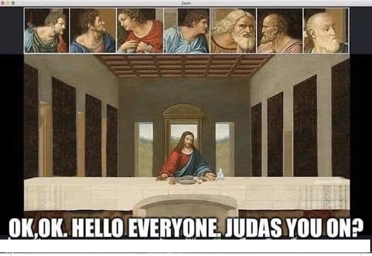 La réunion de groupe est annulée en raison des règles de distanciation sociale, ce qui amène Jésus à organiser une réunion en visioconférence à la place. Judas (le deuxième à partir de la gauche) détourne le regard de la caméra de manière furtive, conscient qu’en raison de sa propre trahison, Jésus sera bientôt assassiné.