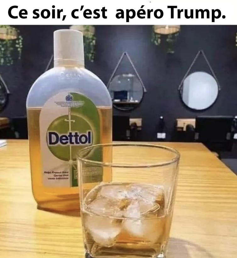 La parution de ces mèmes a fait suite à la déclaration surprenante du Président Trump en avril dernier, relayée par tous les médias, suggérant de boire des désinfectants (y compris de l’eau de Javel) pour se protéger du coronavirus.
