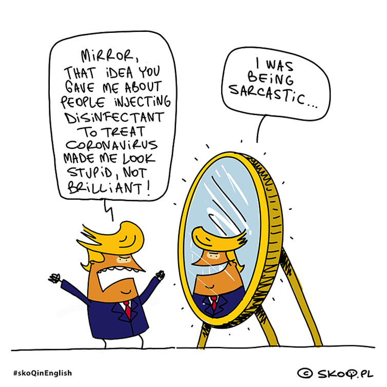 L’image de SkoQ puise son inspiration dans l’incapacité chronique de Trump à faire amende honorable auprès de ceux qui ont suivi ses soi-disant « conseils de santé » en détournant la métaphore du miroir de la vaniteuse belle-mère de Blanche-Neige.