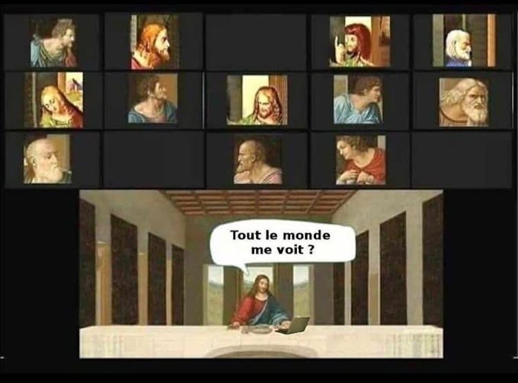 Un second mème, composé cette fois d’images interconnectées, semblable à un écran Zoom, fait également référence à l’œuvre maîtresse de Léonard de Vinci. Il s’agit, tout comme le mème précédent, d’un [chronotope], notion développée par le théoricien littéraire [Mikhail Bakhtin] pour désigner une trame narrative dont les coordonnées sont configurées à travers le temps et l’espace.
