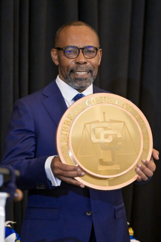 Le président du CCJ, l’honorable juge Winston Anderson, tient le sceau du CCJ lors de sa cérémonie d’investiture qui s’est tenue ce week-end. Photo : CCJ