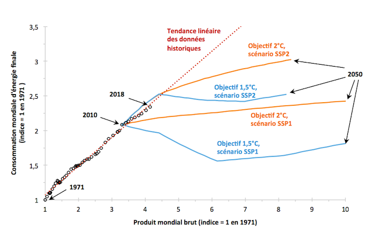 On a représenté sur ce graphique la trajectoire de l’économie mondiale en matière de consommation d’énergie finale (en ordonnées) et de production économique (en abscisses), soit avec les données de la période 1971-2018 (rond noir), soit dans le cadre de quelques scénarios du GIEC permettant de stabiliser le changement climatique à 1,5 °C ou 2 °C (respectivement en bleu et en orange).