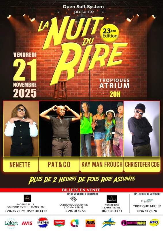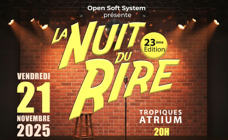 La Nuit du Rire revient enfin ! Après une attente impatiente du public, OPEN SOFT SYSTEM annonce le grand retour de l’un des événements humoristiques les plus populaires de Martinique. Cette 23ᵉ édition, qui se tiendra le vendredi 21 novembre 2025 à Tropiques Atrium de 20h00 à 23h00, réunira sur scène plusieurs figures emblématiques du rire martiniquais… et une grande première très attendue.