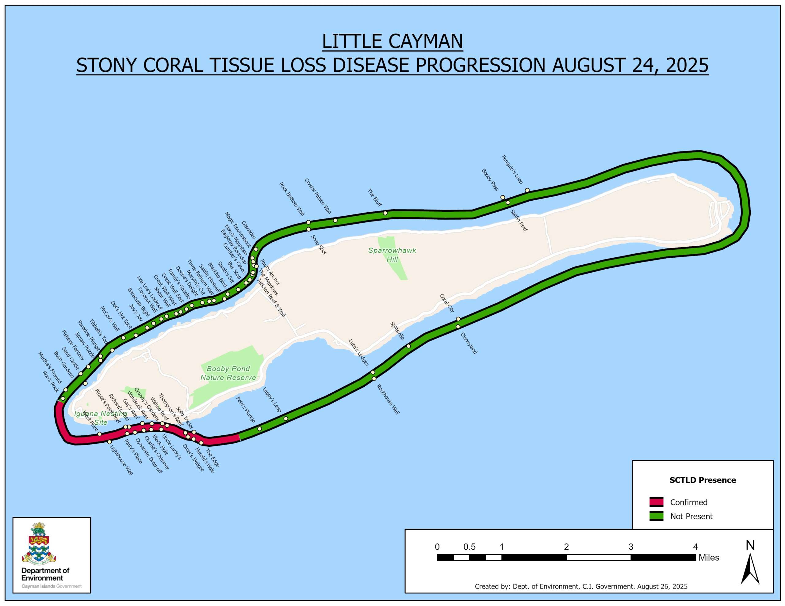 Les sites où la SCTLD a été confirmée se trouvent le long d’une portion de littoral d’un mile. Ainsi, sur la base des données sur la vitesse de propagation de la maladie à Grand Cayman après sa première découverte en 2020, les chercheurs du ministère de l’Environnement ont estimé que l’infection est arrivée à Little Cayman en juillet.
