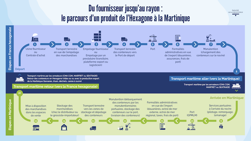 Compte tenu de l’insularité et l’éloignement de la Martinique par rapport à l’Hexagone, de nombreuses étapes et l’intervention d’une multitude d’opérateurs sont nécessaires pour assurer l’acheminement des marchandises sur le territoire.