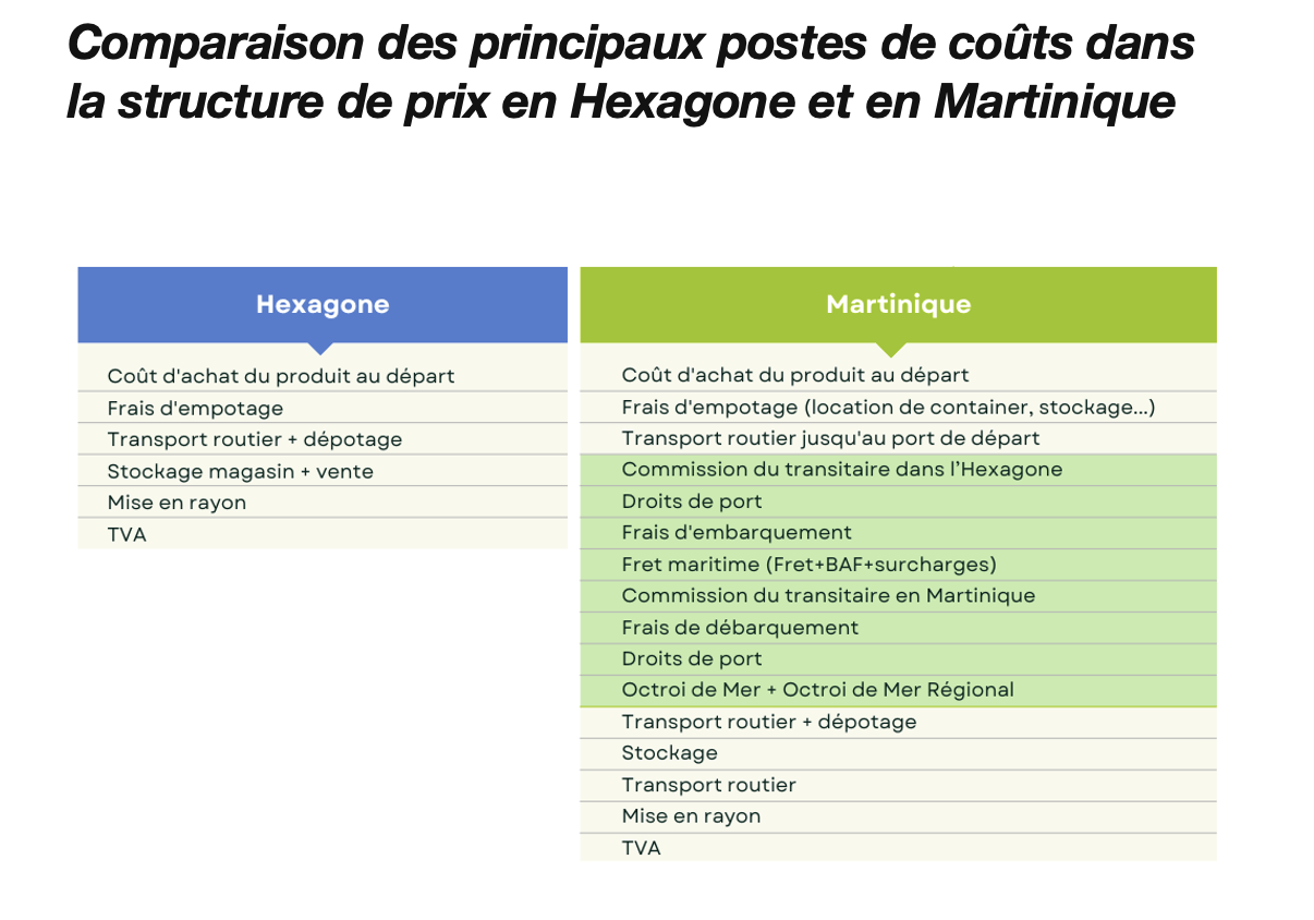 Ensuite, comme elle l’avait déjà constaté dans ses précédents avis (n°09-A-45 du 8 septembre 2009 relatif aux mécanismes d’importation et de distribution des produits de grande consommation dans les départements d’outre-mer et n°19-A-12 du 4 juillet 2019 concernant le fonctionnement de la concurrence en outre-mer), l’Autorité relève que la persistance des écarts de prix significatifs entre la Martinique et l’Hexagone s’explique par des raisons multifactorielles et notamment structurelles, qui perdurent. Enfin, l’Autorité procède à une analyse des marges des grossistes-importateurs et des acteurs de la grande distribution intégrés, actifs sur le territoire.