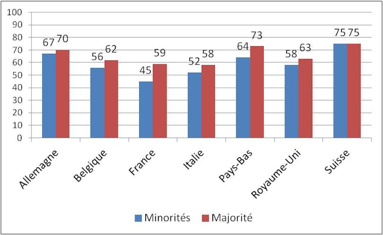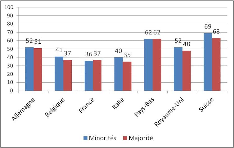 On a pris comme point de comparaison des pays européens qui représentent des situations assez contrastées tant sur le plan géographique ou de leurs politiques migratoires que sur le plan religieux (pays très catholiques comme l’Italie, largement protestants comme le Royaume-Uni). La proportion de l’échantillon considérant appartenir à un groupe ethnique minoritaire est de 4 % en Italie, 5 % en Belgique comme en France, 7 % en Suisse, 8 % en Allemagne et aux Pays-Bas, 9 % au Royaume-Uni, ce qui donne des sous-échantillons réduits allant d’une centaine d’enquêtés (France) à deux cents (Royaume-Uni) mais suffisants pour mener quelques analyses comparatives.