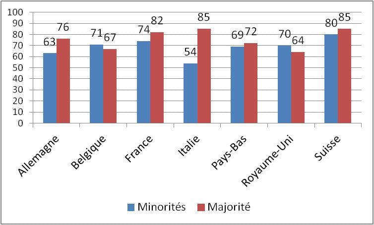 C’est particulièrement et paradoxalement le cas de la France où cette proportion (calculée de la même façon que précédemment) est de 74 %, le second meilleur résultat après la Suisse (80 %), alors que l’attachement affectif au pays de résidence n’est que de 54 % en Italie où le contraste avec le groupe majoritaire sur ce terrain est le plus fort. En Belgique et au Royaume-Uni, les membres des groupes ethniques minoritaires semblent même plus attachés à leur pays d’adoption que les membres du groupe majoritaire.