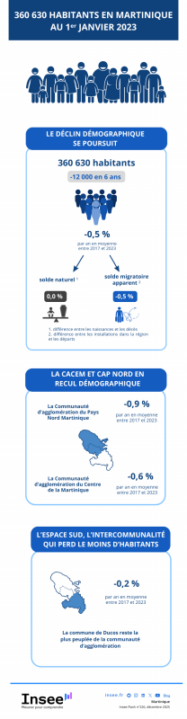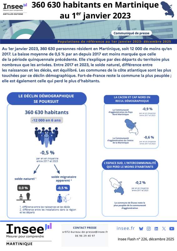 Les derniers chiffres publiés par l’Insee confirment une tendance lourde : la Martinique continue de perdre des habitants. Au 1er janvier 2023, l’île compte 360 630 résidents, soit 12 000 personnes de moins qu’en 2017. La baisse est désormais structurelle et s’explique avant tout par les départs, plus nombreux que les arrivées.