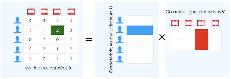 L’idée mathématique sous-jacente est de décomposer la matrice des données D en produit de deux petites matrices U et V. Une telle décomposition permet de caractériser les personnes (à travers la matrice U) et les vidéos (à travers la matrice V) par un petit nombre k de vecteurs.