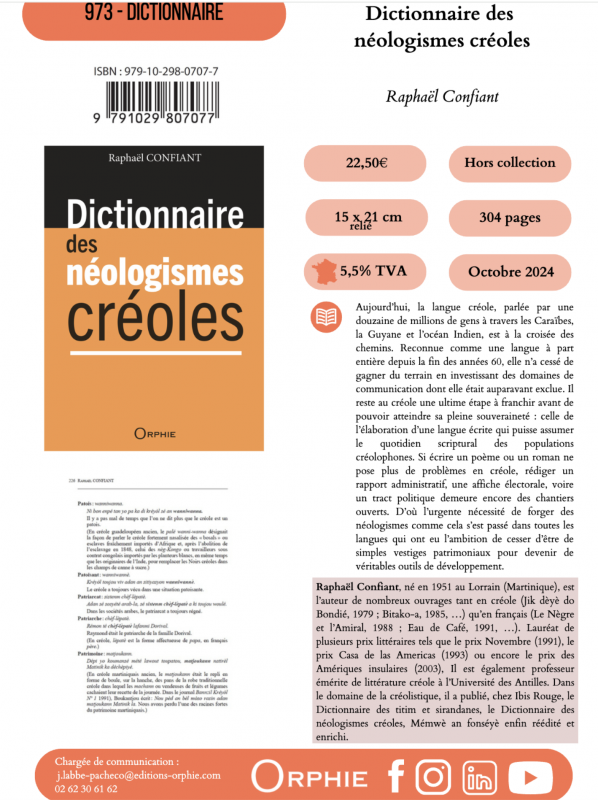 En 2001, il y a donc 23 ans, je publiais aux éditions Ibis Rouge (Guyane) le tout premier Dictionnaire des néologismes créoles. Aujourd’hui, j’en publie une version revue et augmentée aux éditions Orphie (La Réunion). Source : www.raphaelconfiant.com