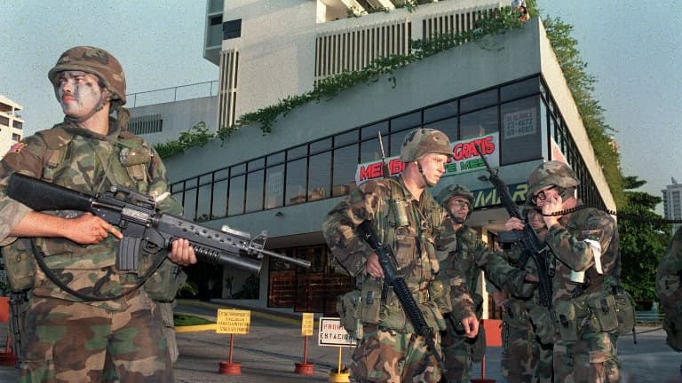 Le 20 décembre 1989, environ 27 000 soldats américains, appuyés par 300 avions et hélicoptères, envahissent le Panama. Washington affirme vouloir protéger ses ressortissants, arrêter Noriega pour trafic de drogue, soutenir l’installation du président élu Guillermo Endara et sécuriser le canal de Panama, vital pour le commerce international.