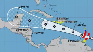 Le portail de la NOAA montre la trajectoire potentielle de la tempête, qui pourrait inclure la Jamaïque et les îles Caïmans dans le courant de la semaine, bien qu’il soit encore trop tôt pour le dire.