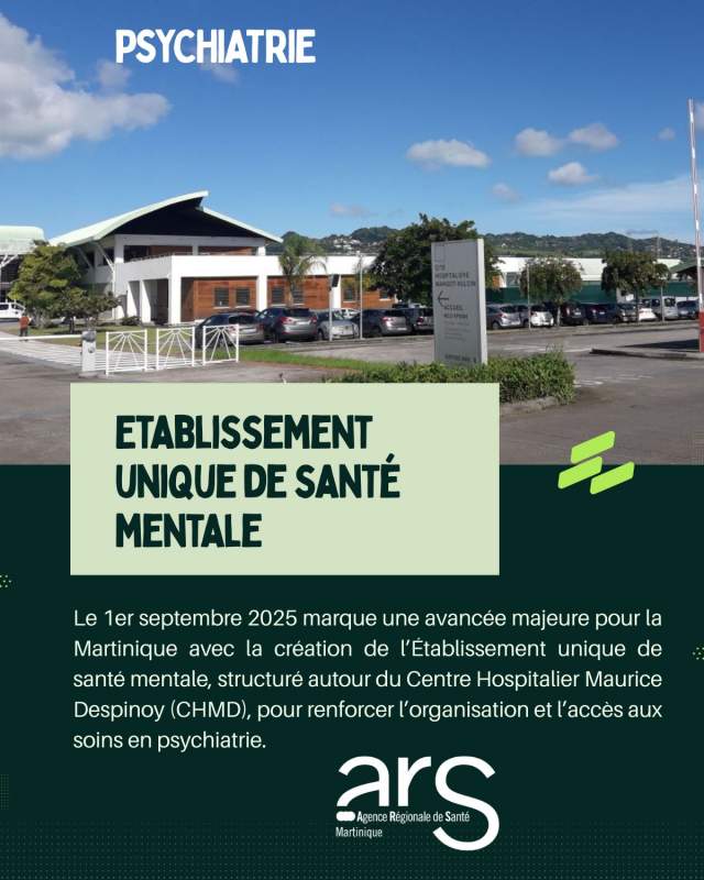 Depuis le 1er septembre 2025, la Martinique a franchi un cap décisif avec la mise en place d’un établissement unique de santé mentale, désormais organisé autour du Centre Hospitalier Maurice Despinoy (CHMD). Cette réforme d’ampleur, impulsée par l’ARS Martinique en partenariat avec le CHU et le CHMD, redessine profondément l’offre psychiatrique publique sur le territoire.