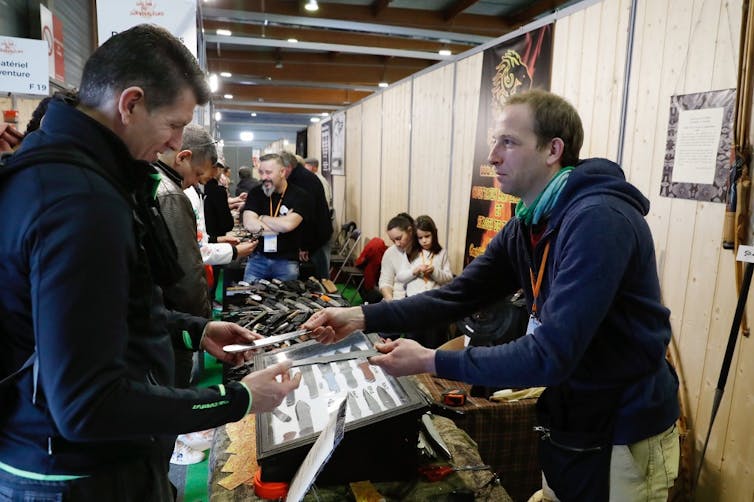 Au Vieux Campeur, enseigne d’activités outdoor créée en 1941, s’est elle aussi mise au survivalisme. Son stand au Salon du Survivalisme en 2018 était conçu comme un dédale de grottes assez peu engageantes avec démonstration de gourdes de filtrage devant un point d’eau croupi.